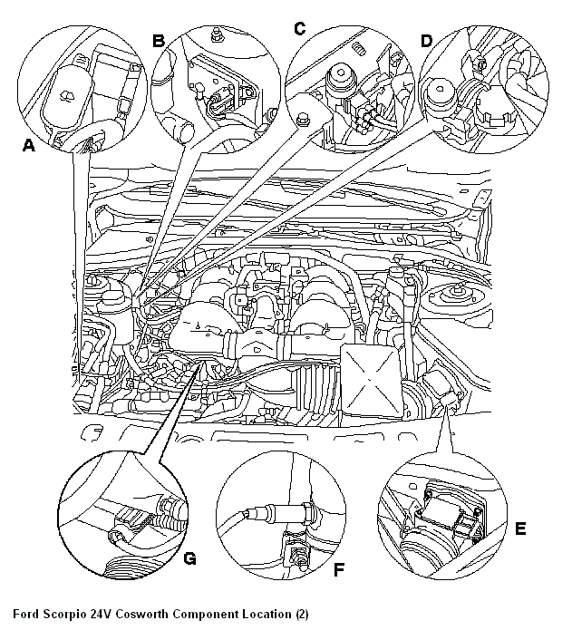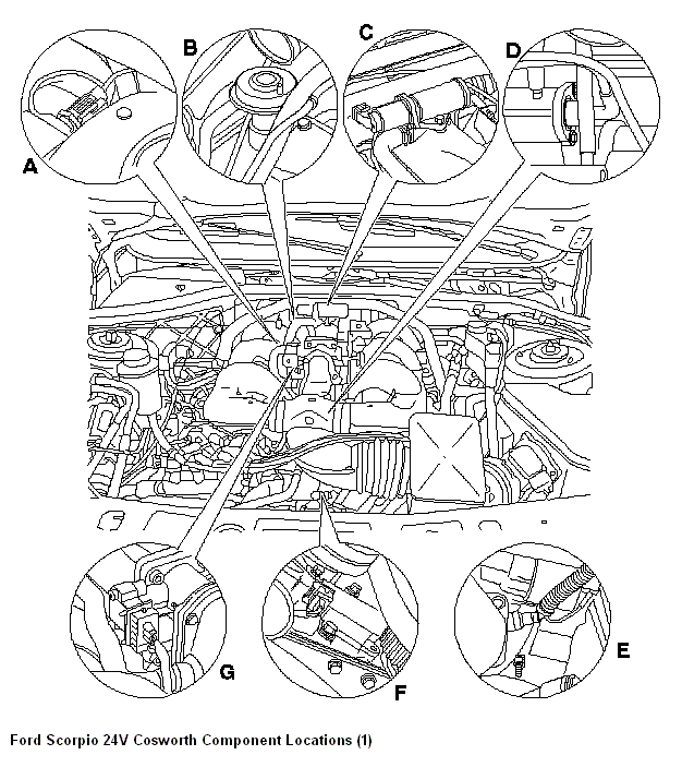 To assist with component identification, this is a view of the components on the 24V Cosworth engine. A. - IAT sensor A. - EI system module