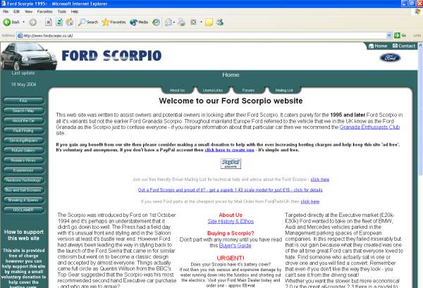 It is their care that the gear engages, it is Steve C, Pete C, and Eric R, the Founders of WWW.FORDSCORPIO.CO.UK, welcome you to the finest, largest, most detailed and comprehensive single-marque car site on the Web, dedicated to the best large European saloon ever made by Ford. This is a site written by and for enthusiasts and owners of the Ford Scorpio 1995-on. HISTORY How did all this begin? In the beginning there was the Ford Scorpio. Introduced in the end of 1994 and vilified for its controversial front treatment (not at all controversial now) - sales of the marque were far less than expected and many thousands stood in fields awaiting a buyer. Production was swiftly reined back and sales never reached Granada numbers, which was a shame because Ford had spend millions on Noise, Vibration and Harshness, (NVH), new suspension, new engines, the latest engine management (EECV) and multiplex wiring systems. Their finest long distance tourer ended production in July 1998. With no Haynes manual, owners struggled to get any information on their model. Eric R wrote some articles about his 24V Estate for a Granada Enthusiasts site, and through the Scorpio Forum met Pete C in 2000. Both exchanged information and built up useful contacts inside the motor industry, and over the next year they were able to help many owners with useful advice. It is humbling to remember how little we knew about the car then - we had to fight for every little scrap of info - from the MOT garages, from Ford Main Dealers, service managers, independent garages' servicing manuals and from other Scorpio owners. On the Forum we soon built up a lively community - but it all ended when in late 2000 some of our posts on the Forum were removed without explanation, and Pete C and Eric R withdrew from the Granada site. This left owners without a forum - so in October 2000 Pete C set up a Message List on his own server. This had just got started when Steve C, an IT professional and 24V owner, offered to host the mail List and a dedicated Scorpio site on his own server. He dismantled Eric R's old Granada Enthusiast Scorpio pages and installed them into FORDSCORPIO.CO.UK with a new Scorpio Forum added later. Steve has spent the intervening years working through server crashes, motherboard faults and house moves to keep the site running. Over the past four years there have been some triumphs - patient research and hard work have paid dividends. Here are the highlights - February 2001 - FORDSCORPIO.CO.ÚK launched. Steve C disassembled the old pages from the Granada site and redesigned them (with cleaner HTML, lol) into the new site, added more pages - and established the first (of three at the last count) Mailing Lists. The Forum followed a few months later. There were many more questions than answers at this stage, however quite early on the site discovered that a vibration problem on the power steering was caused by an incorrect installation and that some of the early catalysts were faulty and failed early. We established that the old EECIV Star reader would not work with our petrol models and it seemed that we would always have to rely on garages to read Diagnostic Trouble Codes. Torque settings, service and repair information were all unknown.