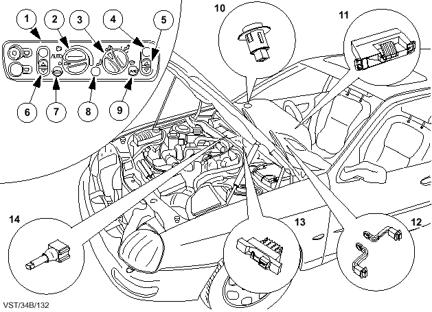 AIR CONDITIONING The lowest specification Scorpio models may not have air conditioning fitted at all - idle pulleys may be fitted on the drive belts at the front of the engine in place of a compressor. Mid-specification models have air conditioning, in which the interior temperature is controlled manually by the driver by selecting the aircon on/off switch and juggling with the heater control. Higher specification models have SATC (Semi-Automatic Air Conditioning) in which the temperature of each side of the front of the cabin is maintained according to preference. The Scorpio was the first Ford car with installed SATC. At delivery, every car equipped with the new Ford Climate Control had an audio tape explaining how the system worked. Listen to this now! (1.1 Mb MP3 file) ScorpioCC [Right-button click and select download] - thanks to PeteC. After some years of research by Pete C and contributions by many other owners, the AC Index is now a most complete resource. Every aspect of the Air Con and Climate Control (SATC) is now covered, and details are given in the menu on the left. A Booster Modification is available to increase the SATC performance in very hot weather - see A/C Booster Mod on the left menu. The full workshop manuals for the Heater and Air Conditioning are the lowest two buttons on the left menu. 1. Heater/Aircon controls panel (LHD shown) 2. Blower control 3. Air distribution switch 4. RHS temperature LCD 5. RHS temperature control 6. LHS temperature control 7. Recirculated Air switch 8. Inside Temperature sensor 9. Air Conditioning switch 10. Sun load sensor 11. SATC module 12. Discharge temperature sensors (in heater housing) 13. Heater Blower Control module (on evaporator) 14. Outside Temperature sensor (on evaporator) (Not shown) Evaporator temperature sensor