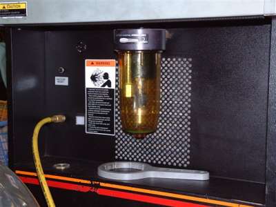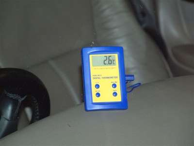 I rang for an appointment for a home visit. In the meantime, there was a job I had been meaning to see to - upgrading the sticker for the AC capacities from the 740g to 1000 grams of gas. I collected this from my Ford Main Dealer (cost £1.49) so that the car was ready for the aircon guy - without the sticker he wouldn't put the new recommended amount of gas into the system: the 740g fill is virtually standard for all Fords, with the possible exception of the Ka. I left the car in the garage in case it rained, and Mark, the son of the proprietor, duly arrived. I helped him bundle the heavy machine out of his van into the garage - normally, on the roadside the machine stays where it is, but it was threatening to rain and I wanted us to stay dry - and then it was plugged in. Aircon Direct use the latest, computer controlled equipment to recover the gas, clean it and then recharge the system. Below, the Sun MRC334 machine. On the right, a view of the 134a gas bottle. This stands on scales which the machine uses to weigh off the correct amount of gas. The machine is plugged into the mains and the gas connections are made, one each to the pressure line and to the receiver/dryer. Mark now dials in the procedure he wants the machine to adopt. The length of time taken to draw the system down into vacuum, the length of time to stay in vacuum and the amount of gas with which to recharge is all programmed in. Then Mark starts it, and we can relax. Time for tea, two sugars. The low and high pressure hoses from the air lines on the car terminate in this gas block, with a dial for each. The centre connection is to the machine, which draws out the gas back into a recuperator. Below, the bottle separator on the front of the machine. In my case, there was so little gas left that it didn't show here. In the middle of the procedure, Mark measures out the extra refrigerant oil which Ford states is necessary for the new gas level, 60 ml. He takes off the gas line from the block and the vacuum sucks it up as soon as he opens the tap: Then the machine continues, and the gas is withdrawn from the tank together with the 210 grams recovered from the system, and you can watch the measurement on the machine as the gas is sucked into the vacuum. It stops at 1000 grams. Excellent. We finish our tea and let the system settle for a while, then we run the engine and watch my digital thermo through the windscreen. Remember, previously the vent temperature was 12º C at 1500 RPM. Without touching the throttle, we watch the temperature fall. Within seconds it's gone lower than I've ever seen it, then still further. I managed a shot here, 2.6 C - and this at idle. The AC was cycling, and the next cycle showed the vent temperature stop at 2.1º C, while the ambient in the garage was quite warm because of the engine, 23 C. At this temperature a vent temp of 3.8º would have been at the low end of specification, and only at 1500 RPM, while we had not touched the accelerator at all! Next, Mark checked the system for leaks, both visually and with a detector. The magic Wand is very sensitive and a slow scan at all the joins and the condenser revealed nothing - but we didn't really expect any. If there had been a leak after four years there wouldn't have been any gas left at all.
