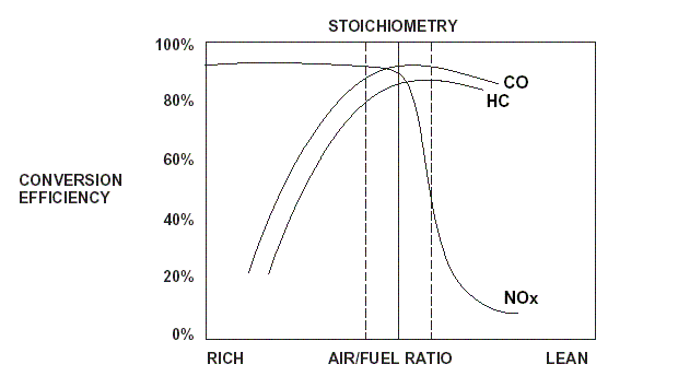 Now we must consider the configuration of the Sensors and the Catalysts. The HO2S sensors are numbered so that the upstream sensor 1 is always on the Bank which contains Cylinder # One. The down stream sensor is numbered 2. Hence the DOHC engine designs contain the HO2S sensors 11 (forward of the Catalyst) and 12 (downstream of the catalyst). On the V6 24V (the 12V is not included here because it uses the EECIV and a Y-pipe arrangement) the driver's side of the engine contains Cylinder 1, so the configuration is shown here: HO2S (Hot Oxygen) sensors develop a voltage between 0.1 volt and 0.9 volt depending on the amount of Hot Oxygen to which it is exposed in the exhaust stream. In Lean conditions (High in Oxygen, low fuel level) the sensor returns a low voltage, while in Rich conditions, (Low Oxygen, high fuel) it reads high. The change between the two readings occurs suddenly in what is known as a 'switch', but this term does not have any electrical connotation.. This effect is illustrated in the figure below: Note that the sensor 'switches' suddenly depending on the stoichometry of the exhaust gas. The sensor is not measuring the Lamda of the exhaust, but only whether it is Rich or Lean - and this illustrates that the term Lambda Sensor is a misnomer. It's correct name is Hot Oxygen sensor, abbreviated in OBD to HO2S. Why go to the bother of changing constantly between Rich and Lean of Stoichometry? Why not stick at Lambda and stay there? The answer is the way in which the modern Fast Light Off 3-way catalysts work. These catalysts are designed to reduce levels of Nitreous Oxide (NOx), Carbon Monoxide (CO) and unburnt fuel hydrocarbons (HC) to the lowest levels possible, using chemical reactions with the active element. This uses an oxidation function to convert CO and HC, and a reduction function to convert NOx. The following figure demonstrates this: During Lean periods, the Catalyst converts the HC and stores the remaining oxygen, while in Rich periods the catalyst releases the stored oxygen and converts the excess HC. Outside of this narrow band of stoichometry the catalyst efficiency drops off sharply. HO2S sensors cannot detect the exact stoichometry of the exhaust gas, they can only detect if the gas is Rich or Lean - so fuelling is controlled by the PCM to switch to Lean (short timing on INJectors) when the HO2S detects a Rich mixture, and switch to Rich fuelling when the exhaust gas is shown as Lean. Additional control of NOx is achieved through Exhaust Gas Recirculation (EGR) which has a separate Monitor. The Catalyst Monitor Before the EXECUTIVE runs the test the following conditions must be met: