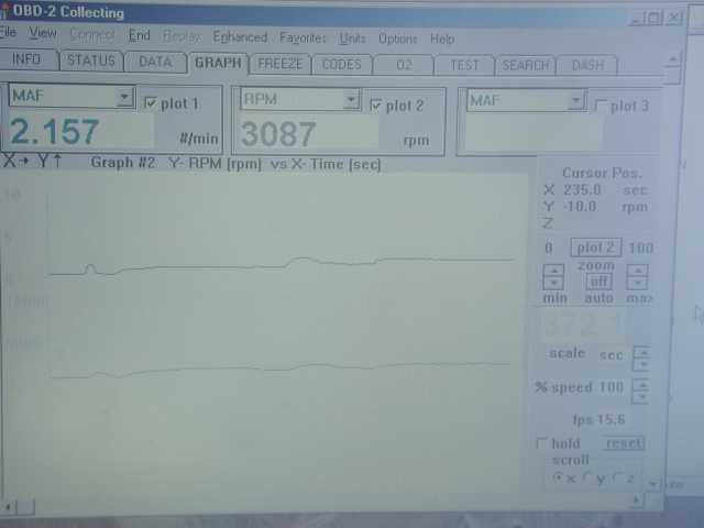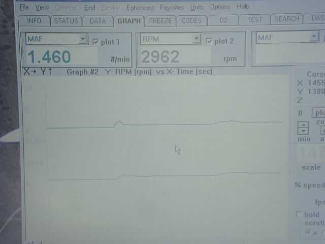 At 2397 rpm the MAF is reading 1.366 lb/min and returning the revs to idle, at