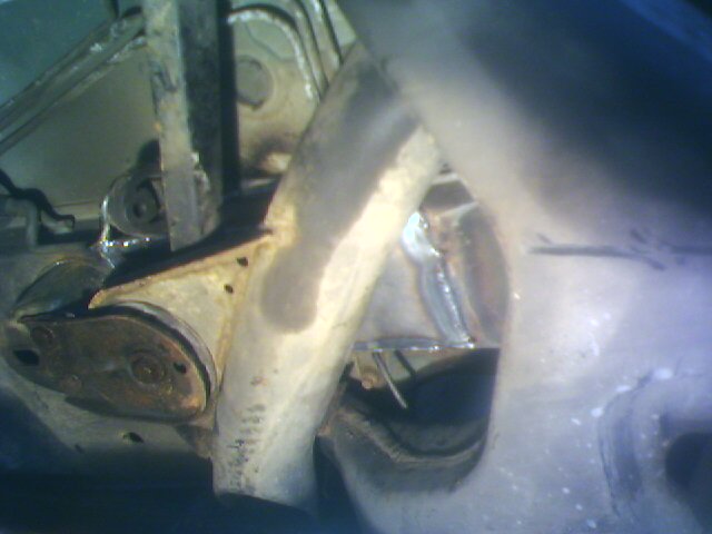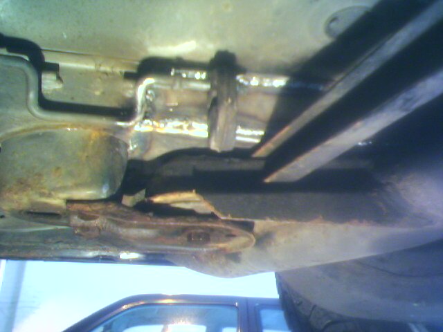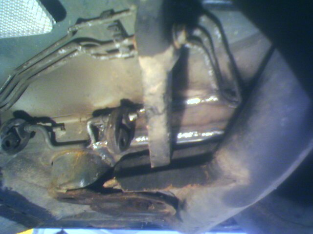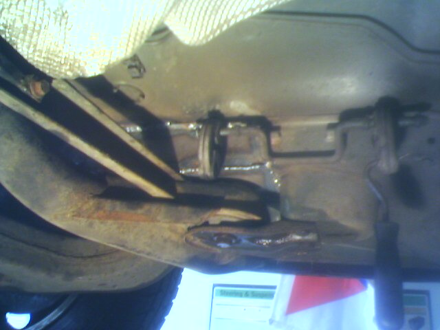 When the MOT inspector‘s report was read out to me I nearly wept 'cos on seeing the rust I thought “It’s a long job” I was right and my welding engineer told me what it entailed: 1. Dropping the whole rear axle and exhaust. 2. Making up new sections. 3. Welding them on. 4. Putting everything back 2 and 3 are the easy bits and so is 4. But 1 is a B (that is the only letter I think the Web Bosses will allow of that Word) The main bolt that goes through Big Isolation Rubber Bush into the captive chassis nut is the main bugbear as it can seize solid but luckily mine came out with Plus-gas and perseverance by the guys at the garage! I couldn’t take any photos while they were doing the job but they kindly let me take photos of the welded job before they painted and finished the bolting up. Right hand side The Problem Where the Main bolt goes through the Big Isolator Rubber