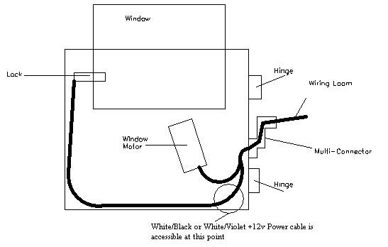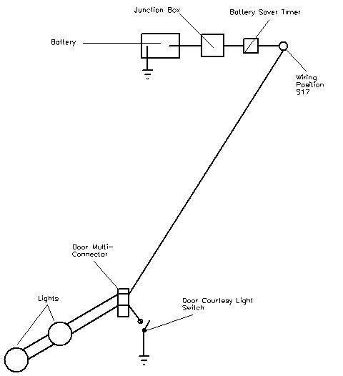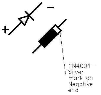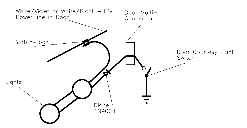 Providing power Even if there is a hole in the door base, it is unlikely that the wiring inside the door to connect the lights up will exist. So, as well as the light harness, ancillary wiring is needed. The plug which conects to the light unit socket will be useful. Also, the light cables pass through a multi-connector at the door hinge, and the pins and sockets for the door lights will not be in the connector if the car did not have the light option originally. If a multi-connector or two can be found, pin/socket pairs can be salvaged to replace the missing ones. A simple schematic of the original under-door lighting circuit is shown here. Power is taken from a central +12v point controlled by a battery-saving timer, and then passed to each door light. It then returns to ground via the door-open switch, so the lights come on when the door is open. Original Schematic In-door only wiring If all doors and boot are open on a car with footwell lights as well, the total drain will be the best part of 100W. So you can see why a saver circuit is a good idea. Unfortunately, the saver-controlled wiring position S17 is believed to lie behind the dashboard, and gaining access to it is not easy. So this piece describes a simpler way to connect the lights, using the internal door wiring +12v line to the door lock. This keeps most of the work inside the door, and saves threading long lengths of cable through the car. The down-side is that there is no battery saver circuit, so the doors should not be left open with the lights on for ages!. \par \par The internal door wiring looks like the drawing below. There is only one appropriate wire to power the lights in each door, which is contained in the loom at the point specified. It is usually easy to separate the wires at this point, and I think that all cars will have this particular wire. It is coloured White/Violet in the front doors, where it comes from pin 16 of the multi-connector, while in the rear doors it is coloured White/Black, and comes from pin 6. It is +12V at all times that the door is unlocked, and connected to earth when it is locked. In each door I tested the wire with a multi-meter and a dressmakers pin to be sure I had the right one before connecting. Scorpio door wiring The revised schematic for connection is fairly simple, and is shown below. A Scotchlock connector takes the +12v from the door Power cable and passes it to the light harness. The return cable from the light harness goes through the multi-connector, and terminates in the courtesy switch in the car body, just as the standard Ford design does. New Connection Schematic One complexity is that this Power cable is connected to earth when the car is locked. So the entire light system out to the courtesy switch is grounded at this time. Unfortunately, other circuits also monitor the state of the courtesy switch - if it is grounded the door must be open. So a direct connection to this Power cable makes the car think the door is open when it is locked, and the internal lights will be turned on. We can prevent this by putting a diode in the line which will stop this reverse current. Shown on the circuit is a 1N4001 diode (obtainable at Maplins, P/N 1141234). The diode must be connected into the circuit the right way around - the diagram below shows how to tell which this is. Diode Diagram