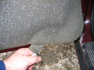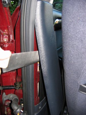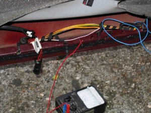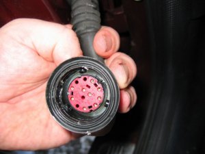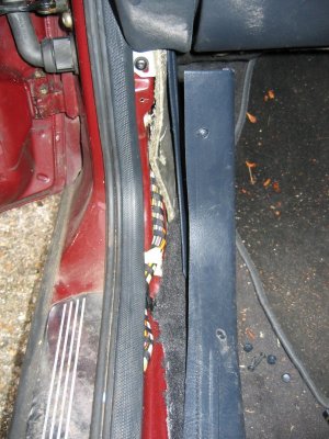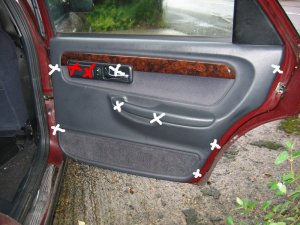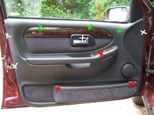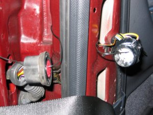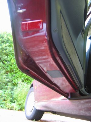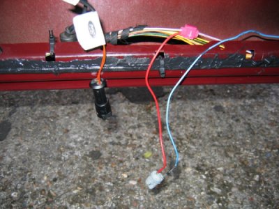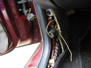 Doing the Work Needed: 4 sets of under-door lights Holes to put them in (see Template above) 4 Scotch-locks for 5A wire 4 diodes - 1N4001 will do A cross-head screwdriver and a flat one with a long shaft About 5 yards of thin 2A wire. A large knife 1 foot long metal tube about 3/16" in diameter (see Step 3 below!) Wiring ties if you cut any Soldering iron, or some method of connecting and insulating wires. Nice to have: The full wiring harness, including multi-connector plug and socket A multi-meter pins and sockets for the multi-connector Process Step 1 - I made up the connections. If I had the full harness I might have looked for power from a different point inside the car body. Point S17, if I could find it, or the footwell lights if I had them were possibilities. If I had the pins/sockets for the multi-connector I would have broken the wires at this point and installed the extra connections. I decided to make up a harness plug from filler, but I could have bought an original plug, or cut the Ford one off and soldered extension wires directly on.\par \par For my door-connector loom the following cables were extended from the end of the light harness plug: - a cable approx 1ft, ending in a Scotchlock, for connecting to the in-door power cable +12V.\par - a thin cable approx 3 ft, for connecting through the multi-connector to the door-open switch. (But not attached yet - the cable will need to be threaded through some narrow spaces first!). Note the (hard to see!) diode attached to the plug in the picture below. Made-up plug and harness picture Step 2 - I removed the internal door panel. A detailed write-up on how to do this is described at http://www.fordscorpio.co.uk/doorlockrep.htm but a picture is included below showing the location of the screws. There are 6 in the front and 10 in the rear, some hidden under the arm-rest or behind the window switch panel but once undone the panel lifts up and away from the door easily - the easiest of all car door panels I have ever removed! In the pictures the white crosses are visible screws, the red ones are hidden behind a cover, while the green ones are push studs connecting behind the door. Front Door Panel Rear Door Panel Behind the panel is sound proofing sponge foam. I unsealed this at the bottom of the door, using the knife to cut through the mastic and peel the foam plastic away. If the weather is hot it comes off easily. It will immediately join again if you push it back. Sound proofing separation At this point I could install the light units. There is a little steel spring clip which holds them onto the door skin. It's also a good idea to find and test the power cable which will be used - I used a dressmakers pin to connect to it. Light unit installed Testing the Power wire Step 3 - The hardest job is to connect the earth lead from the light harness through the multi-connector to the courtesy switch. Since I did not have the extra pin/socket for the multi-connector I passed the cable directly through the holes in the multi-connector where the pin/socket is missing. Cheeky, but it works, and can easily be upgraded later if necessary. The only difficulty is that you need thin wire \endash standard 5A is too thick. The actual drain when running is 1A, so 2A wire should be fine. Multi-connector Multi connector open Missing holes After undoing the multi-connector, (it turns easily), I prised off the rubber hose which carries the wires through into the door at the connector, and pulled it out where it connects into the door. Then I pushed the metal tube up through it, so I could easily thread the earth wire through. Did you wonder what it was needed for? It's easiest to begin in the middle, by pushing the wire through one of the spare multi-connector holes. Then I passed it through the metal tube in the rubber hose, and removed the tube. Finally, I connected the earth wire to my diode and plug. Releasing rear trim Rear trim internal connectors Next I went inside the car, and removed the trim behind the multi-connector base. For the rear doors multi-connector it can be prised out with the knife. The base of the multi-connector is held with a lip which can be bent up, allowing the multi-connector to be rotated and removed. I passed the cable through the hole in the side of the car, then the hole in the multi-connector base which corresponded to the hole I had used in the other half. Once done I replaced the multi-connector base. Wire through rear connector Wire through front connector The front of the car was more tricky. The plastic panels by the sills have to be undone before levering off the trim in the footwell. Then I was faced with some sound proofing, held down with a plastic plug. After levering the plug off, I could just get my hand behind the sound proofing to touch the multi-connector. To release the metal lip which retains it, I had to cut a flap in the sound proofing and use a long screwdriver to lever the lip up, working blind. Then I had just enough room to remove the multi-connector base. The cable could then be passed through, and the base replaced, as with the rear example. It is probably possible to pass a wire through the multi-conector base without removing it, by using a small mirror to view the holes, and a stiff wire to push the other wires aside. Undoing front trim Levering plug out Once through the multi-connector, the earth wire connects to the door open switch which is about 6" away. There will be a wire already in place there \endash I fixed it to this and then connected the other end of the cable to my diode and plug in the door. Allow enough slack in the car body side to open the multi-connector in the future. Earth Connection Step 4 - Finally, I connected the +12V power line. This was easy - I just undid the door wiring loom clip at the base of the door at the hinge side, and separated out the power cable. White/Violet in the front door, White/Black in the rear. I scotch-locked the +12V power cable to this and c