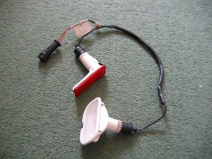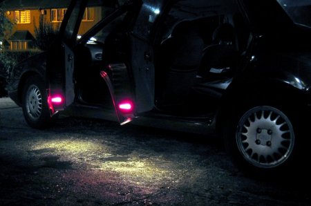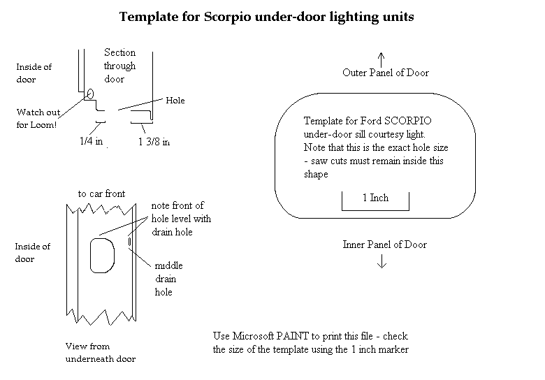 Introduction Later Scorpio Ultima owners have often aired their annoyance on discovering that under-door lighting was withdrawn in 1997, making their fully-loaded car short of an option. However, it is not impossible to retro-fit the feature to any car, and, depending on what is still left in the car, it may be quite easy. Disclaimer This item describes the way I installed under-door lighting. It does not use the standard Ford connections at all points, so results in non-standard wiring. I believe it to be safe, but I am not a qualified car electrician! Of course all wiring work in a car carries some risk of damage, and an incorrect connection can blow an expensive component, or cause a fire. You must take full responsibility for any such work you may do on your own car. Getting the hole and the lights to go in it The first thing to check is whether the car has the under-door hole for fitting the light. Cars which have the hole but no lights are fitted with a blanking plate, as shown in the illustration here. If there is no hole it is always possible to cut one. A template for a proper Ford hole is provided here, but if cheaper non-Ford lights are to be used a different hole may be needed, or even several if a few hi-brightness LEDs are considered! Note that the Ford light units are expensive, and you need four for a car. I understand that Granadas, even Escorts may have similar light units, and a trip to the scrappy, or an examination of Ebay may be called for! Template - TEMPLATE.BMP Download this bitmap and use Ms Paint to print the file. The printed template will then be the correct size. A picture of the Ford pair of lights for a door and their harness is below. Under-door light harness