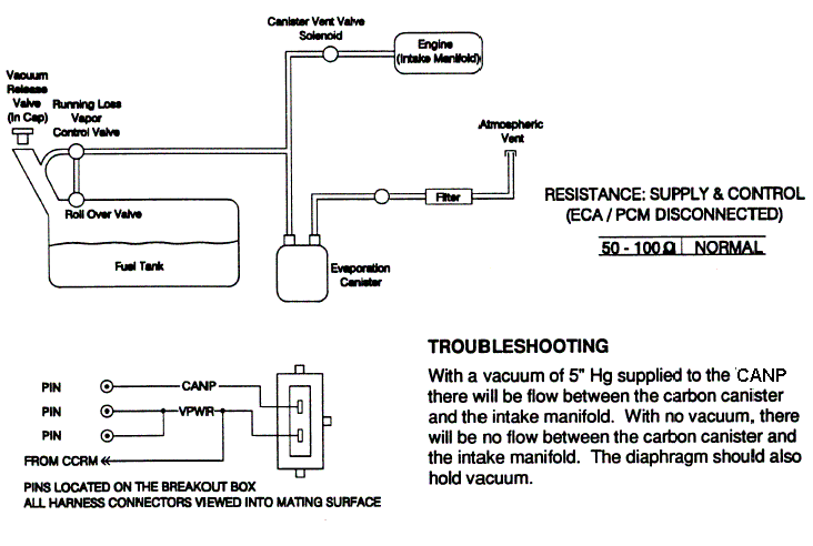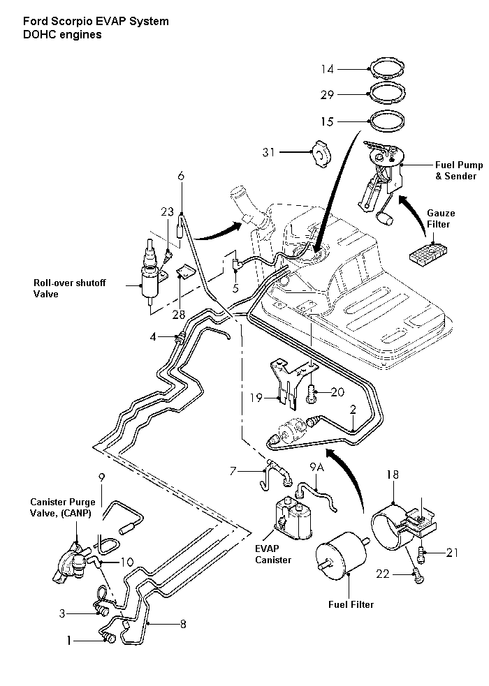 The EVAP system is a simplified version for the Scorpio. A Purge Flow Sensor is apparently omitted, since there is no mention of it on the Ford Catalogue or in the Circuit Diagrams. The diagram below is a representation of the the Scorpio system as far as can be determined. A careful check of all vacuum lines beneath the vehicle, near the fuel tank and in the engine bay, particularly after work in these areas should be made. Testing the CANP should be carried out only after this. Diagrams © Ford (Europe) EricR |