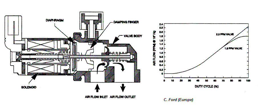 Idle Air Control (IAC)Valve Data The Idle Air Control Valve is a solenoid-operated pintle valve that controls the flow of air through the Throttle Bypass Pipe. This air bypasses the throttle plate and, together with the INJector duration and the Spark Advance, permits the EECV PCM to control engine idle. The solenoid opens and closes the pintle in direct relation to the current supplied by the PCM and operates from 0% to 100% duty cycle - i.e. fully open to fully closed.