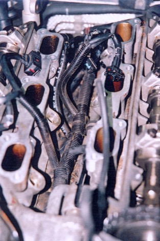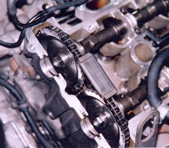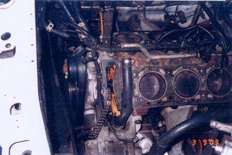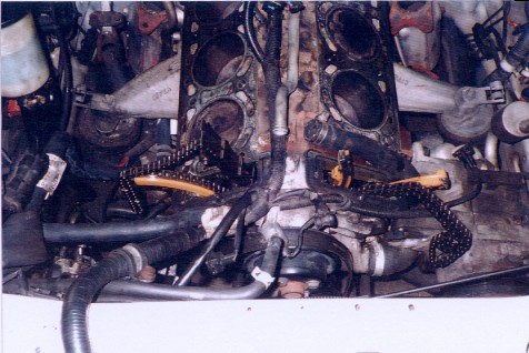 Andrew doubts that this coolant pipe could be changed without removing the cylinder head, so while it was off he had the pipe renewed. On the right, a pix illustrating this. The pipe can be seen in the exact centre of Andrew's photo. It attaches to the coolant housing which connects the two cylinder heads in the V. The metal coolant pipe above it is the supply for the heater. To its left the timing chest is open and the plastic chain guides can be seen. Obviously if you think about it, the two banks of pistons cannot be in line with each other - there must be a stagger to enable space on the single crankshaft to line up with a piston. Here, Cosworth has utilised the space to greatly increase the coolant flow through the heads. If Bank 2 cylinder head is ever off, or even if the Inlet system has been removed, check the condition of this bypass pipe very carefully and consider changing it while you're in there - Finis 7 334 646. NOTE: Steve Waterlow at Inchcape Ford regrets that he is not available for telephone advice. If you need him to look at your engine then make an appointment with the service manager. Details on Recommended Dealers Thanks to Andrew C-W for the detail and the excellent pictures.
