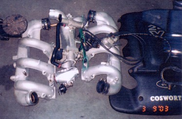 June 2003 Compression tests showed 175psi, but unexpectedly slow to get to pressure. The Lamda sensors were datalogged using WDS, and HO2S11 (Bank 1 pre-catalyst) sensor showed insufficient switching. A gas check showed excessive hydrocarbons in the exhaust (330ppm at idle) and the Bank 1 catalyst was removed, examined but passed fit. The wiring looms through the engine bay were all opened carefully, checked visually, and an oscilloscope confirmed no problems with the wiring. Ignition Kv checks were carried out and found to be uneven, so all of the spark plugs were replaced (again) together with one of the plug leads. July 2003 Cosworth were very helpful. They identified three possible causes of the problem -