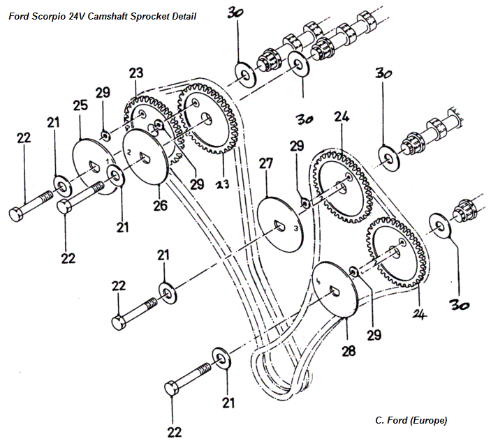 To the right is the Ford Catalogue image. You can see that the camshaft sprockets (23 and 24) have a round hole in the centre. They are not 'keyed' to the camshafts in any way and can spin freely about the camshaft axis. Instead, the lockwashers are keyed to the camshafts by the D shaped hole (they are sometimes called D-Plates) and engage with the face of the sprocket by means of a punched lug on the lockwasher and an insert (29) that fits neatly into the hole in the sprocket. Once the bolt (22) is tightened up the sprocket is locked to the lockwasher between the washers (21 & 30). The lockwashers are: