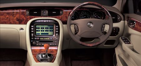 The interior is stunning. It is a sense of occasion just sitting in this car. Like the Scorpio, the new XJ has an analogue clock. The steering wheel shape and control buttons, the position of the electric window panel is familiar - but the burr walnuts is real. This dash has the £2,000 Satnav option built in. Nice if you can get it.