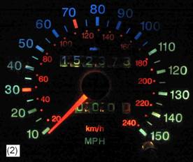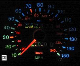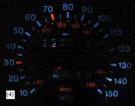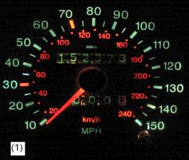 in Dash tests David conducted some tests looking at the practicality of exchanging incandescent bulbs in the instrument fascia with LEDs. These tests are a rough guide only, to show what a dash might look like using LED’s, and these are his results. The test dash is from a 1990 Granada and photographed in a semi dark room. I used small wedge type white LED’s (286) as they were cheaper. They are very directional compared to a normal bulb. I got them to fit in the larger holders for the tests. This would not be practical for normal use. You would need to use 501 size wedge bulbs.( but not the equal to 5w ones ) Photo 1 – normal bulbs x3 positioned behind 20, 80, 140. The wide angle of light dispersal illuminates the rest of the dial. Photo 2 – One LED positioned behind 80. Two normal bulbs behind 20 and 140. Here you can clearly see the blue tinge that is a minor problem with white LED’s. Also because of the LED’s being directional there is loss of illumination at 40-50 and 100.