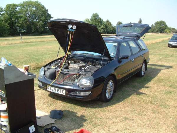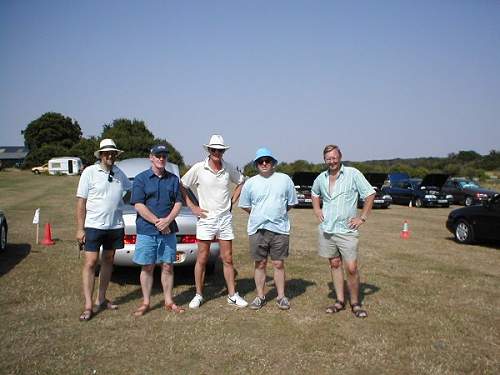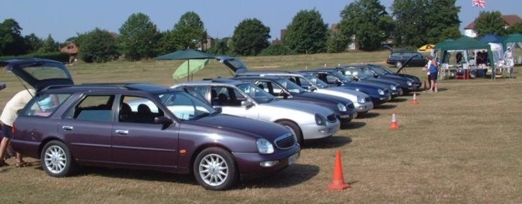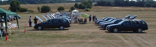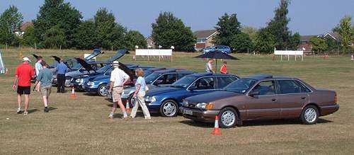 love! With blazing sunshine on what was to be record-breaking temperatures, the temperature soared during the morning. Fortunately, being on the very outermost edge of London with the Green Belt, a steady breeze across the site kept temperatures just about bearable. Two owners arrived while we were still setting up, and helped erect the gazebos to provide a break from the sun - and were they needed ! (Thanks Frank and Del) and by 10:30 a good complete line of Scorpios were lined up in the blazing heat. By noon the temperature was so high that even the cars were yawning with the heat (!) but what a grand sight they looked. John and Mark from Aircon Direct arrived, and from then on they serviced a seemingly endless line of Scorpios and Granadas using three stations, parked over at the Other Marques parking so as not to disturb us with the noise from their generator. They worked like slaves in the merciless heat, testing, checking, explaining - and only regassing when they really thought that a car needed it. What a sterling service - and at a special price to those attending, too. Thanks guys! Meanwhile members gathered in loose knots, chatting and swopping stories. I used my OBD cable and laptop frequently and only found a few DTCs, none serious. Most cars checked out with none - even in that heat. By early afternoon the last arrivals had formed a second line behind the first and every engine and body style was represented and discussed. By now, the temperature had climbed to 36.7C in the shade. It was too hot to stand for long in the sun and too bright to read a laptop without darkening the interior of the car with a blanket. Some owners were captured for long enough to take a snap. The gap behind them in the line of cars was caused by the queue for the AC check The Granada line was not quite as well represented - but they had other meetings that day. There were no Mk 1s, which was a shame because I planned a photo with one car of each mark in a fantail in front of the camera, which would have been a great shot. Nice Granadas there were, though. I particularly admired two late 24V Granadas (the BOA engine) but they left before I could look them over.. This was a great Meet. The heat and sun had been too much to do some of the things I planned, but all in all it was a great day out and the opportunity to meet many of the owners familiar only from posts on the List and the Message Board. It was a wonderful turnout and well worth the effort. Roll on next year! Thanks to owners for the use of their pix. |