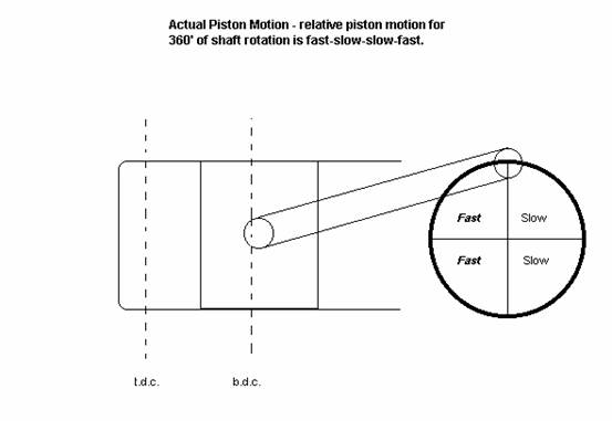 If the speed of the pistons in their path along the cylinders was constant then the laws of Harmonic Motion would apply - but the fact it, they do not. From TDC (Top Dead Centre) the piston travels more than half the length of its stroke in the first 90' of the crankshaft rotation, then it travels relatively slowly while the big end of the connecting road traverses the bottom 180' of the crank throw - then it speeds up rapidly for the return up the cylinder. The figure below illustrates this: