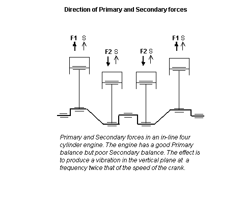 So far from being a smooth harmonic motion, the speed of the piston varies: fast - slow - slow - fast for every crankshaft rotation. At the same time that two pistons are travelling fast, two others are travelling slowly and so there is a net upward force - the Secondary balance. The diagram below illustrates the four cylinder engine with the two forces: