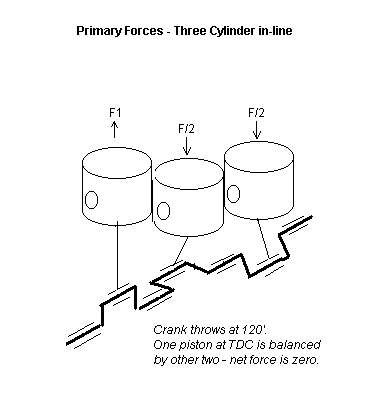 The net effect is a vibration in the vertical plane at a frequency twice that of the speed of the crank. In a three cylinder engine with throws at 120' the Secondary forces cancel out - like this: