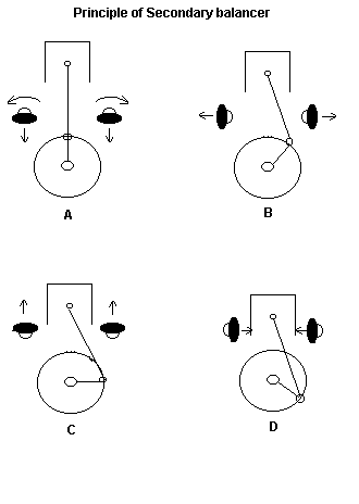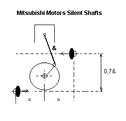 The greater weight and complexity of a six cylinder engine, especially in the lower capacities, militates against using it simply for its refinement - what the vehicle manufacturers need is a four cylinder engine which is light, powerful, economical - and very smooth. Oddly enough, the issue of the Secondary imbalance was addressed as long ago as 1911. The Lanchester cars of that year used secondary balance shafts which did the impossible - it exerted a force upward at the right time, then downward, and did nothing in between. The figure below demonstrates the principle of the secondary balancer: The diagram at A shows the cleverness of the design. Two counter-rotating shafts carry weights and rotate at twice crankshaft speed. They are timed to coincide with two pistons when they are TDC, and balance out the secondary force. In as little as 45' later, B, they are no longer required but they have already turned and in opposing each other the weights cancel out. In C at 90' Crankshaft angle they apply an upward force and then cancel out again in D when their force is no longer required. Spinning in this way in light low-pressure bearings and timed to the crankshaft, the secondary balance shafts were very successful in the Lanchester but were not adopted generally. In 1975 Mitsubishi Motors produced their 'Silent Shafts' design and in many ways it is similar to the Lanchester principle except that the two balancing shafts have been set at different centres so that the shafts can also damp out the rolling force produced by the combustion stroke: