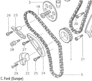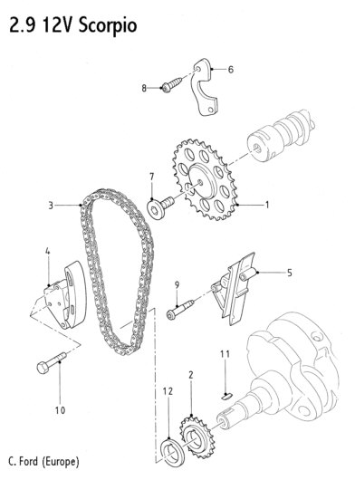a chain tensioner mounted on the offside (4). It then passes over the camshaft