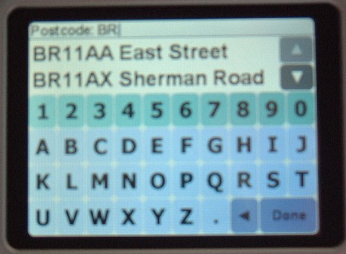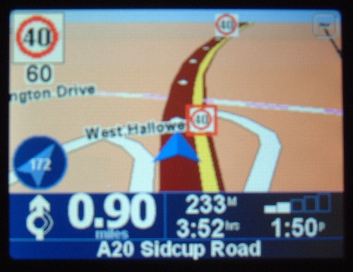Here you can use the TomTom Traffic to receive congestion warnings through your Bluetooth mobile phone, change the preferences and favourites. Touching the Navigate to icon takes you to the next submenu: This menu gives the option of going straight Home, going to a Favourite or even a recent destination that you have used. The address option asks first for a City, then provides a drop-down list that changes as you press the letters - L O N for example takes you straight to London, and the same drop-down list occurs as you press the letters for the street name. POSTCODES My Go 300 was delivered with software Version 5.0. I immediately logged in to the TomTom site and downloaded the new version, 5.2, which gives a Post Code option for selecting an address: Touching the Postcode icon then presents the touch screen typewriter and pressing the buttons for the letter shows the drop down menu for the postcode you are looking for - Above, I have selected the letters BR. I can scroll down the list using the arrows on the right, or I can continue to press the numbers until the postcode is recognised. Then selecting the number of the house means that the Go will take you direct to the door. The unit quickly analyses the roads needed, and if there is a Toll or Congestion charge implicated it will ask you whether you wish to avoid it. You can then look at a text list showing the route, a map of the route selected, and even a Demo mode, where the journey is played out in 3D on the screen. Here the chosen route can be verified before you start out. There is even Itinerary planning, where several locations can be programmed at once, to treat each destination as a way point, and go on to the next. It does not, however, work out the best route to visit all of these destinations - not yet, anyway. NAVIGATING The unit shows the road ahead in 3D perspective, although you can select a flat 2D image if you wish. The following are low-speed displays - at higher speeds non-essential detail is omitted to avoid distraction. The map configures itself so that it always stretches ahead of the driver, a brilliantly simple but effective strategy. Road changes such as junctions and roundabouts are signalled by the blue box on the left below the screen. Above, this shows a roundabout, and I am to go straight ahead in 250 yards. The map also shows the route clearly as I approach, with the correct route highlighted in green. A user-selectable voice announces the action to take and the distance and this advice is repeated as the car reaches the junction. Here, the road selected clearly demonstrates the junction detail around me. The blue box is showing that the next junction to take is a left turn, in 3.7 miles. The faded + and - buttons on the top corners of the screen are to change the perspective of the view - I like to see a bit of horizon so the selected perspective is quite high. The blue arrow in the circle represents North, with the degrees of the current heading shown inside. This is also a new feature of Version 5.2. So far, so excellent. The screen can be dimmed to Night time colours to reduce the glare and, because the roads are shown in perspective, bends ahead at night can be checked with a glance at the screen and assessed for safety, concealed junctions etc. But there's more... POI Points of Interest have been collected by satnav users for some years. They consist of a text list of the latitude and longtitude of given points together with a brief text note, stored by users when they pass a particular location. Many lists have been prepared and can be downloaded freely from the Net. You might be interested in Battlefields, Little Chef restaurants, castles, Iron Age sites and many others. Of course, people were very quick to record Gatso Cameras locations. For several years drivers have been storing the locations of both static and mobile speed cameras when they see them and sending them to the website where they have been collated. Now everyone can download the Speed Camera POIs from PocketGPSWorld. (Although this used to be free, a subscription to the site is needed now via PayPal, £2 per month or £19 per year.) Once you install the POI file and switch them on in the Configure menu to warn when nearby, any current Gatso camera will show on the screen as you approach it. The POI file is updated about every two weeks so few new cameras are missed. The Go unit has built-in sound effects that can be attached to POIs so that they sound when the POI is reached. This attracts the view of the driver. However, these noises are chimes, bells, whistles, and even the moo of a cow, and these are perhaps not the most useful noises to have. Those clever chaps at PocketGPSWorld have created voice files that replace the internal sound effects. This is done simply by replacing the data.chk file on the Go memory card with the downloaded file - now you get a verbal warning as you approach a Gatso camera or a site where mobile cameras have been used. The result of the POI download is plain on the map display: Above, the A2 Rochester Way. Two Gatso cameras are on my route. As I approach them, the new sound effect gives a loud Bong! and the verbal warning "Gatso, 40" The camera icon on the map, flashes, and on the top left corner the same icon is repeated, flashing as it counts down the yards to the camera: Above, the warning as I approach a speed camera. The verbal announcement has already been made, and the icon on the top left of the screen flashes as the yards-to-point decrease. The accuracy of these positions is spot-on; the camera slides past your nearside window as the graphic disappears off the screen. I don't use this facility in order to break the law - but as a useful reminder to check my speed as I pass through. And since we know that the cameras are not for revenue collection, but are only placed in areas where there are many accidents, it warns me that I'm in an accident black spot, doesn't it? Yeah, right. By the 
