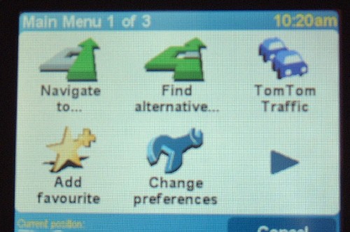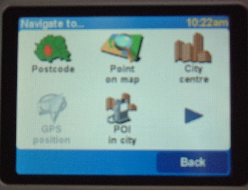 The TomTom Go 300. Slightly too large to slip into a pocket, it has its own carrying case. The size is partly because of the excellent speaker at the rear of the unit - much better sound than you get with a PDA - which can be weedy. This unit can be heard even with the radio on! The 300 is dedicated to TomToms' class-leading navigation software which is installed complete with maps on a single 128Mb memory card. Inside is a rechargeable battery good for 4 hours of continuous use, and the kit is complete with a small carrying case, PC connection lead, in-car charger and mounting arm. Immediately I found that there some issues using this unit on my Scorpio. My Ultima has a quick-clear windscreen, the element of which screens the unit from the satellite signals. The Go did not pick up a signal at all in the centre of the dashboard where I would have liked to put it. Fortunately when I checked the windscreen element it ends well short of the offside windscreen edge, and this clear space is enough to allow the satellite signals to get to the TomTom receiver. Another problem is that the clamping arm provided reduces the reception by up to 30%, so that although the unit will work perfectly while free standing on the right hand edge of the dashboard, as soon as you clamp it up on the arm it loses the signals and gets confused. This is poor, in my opinion - but it is easily remedied by buying a signal antenna - a further £40 approx, but for now I have used it in the extreme right corner of the dash. IMO an ideal location for the antenna would be next to the UV sensor on the top right of the dashboard. When you power it up, the unit shows you a brief TomTom logo and then opens to a map of its last known location while it searches for a signal. Touching the screen brings up the first of three main menus: